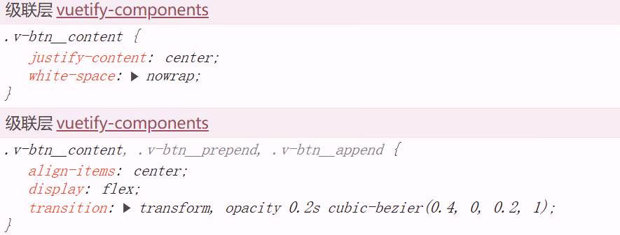 vuetify 在 v3.6.0 引入了 css layer ,所有的样式都会被分类到对应的 layer 上,比如 v-btn 的样式:
