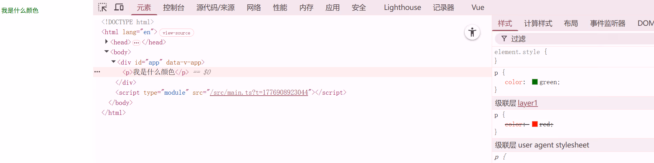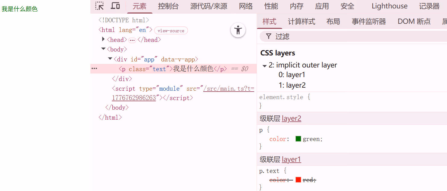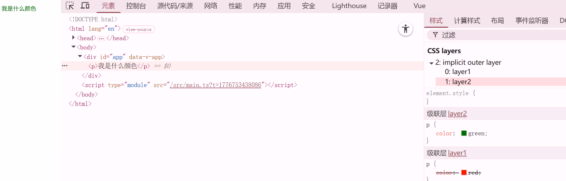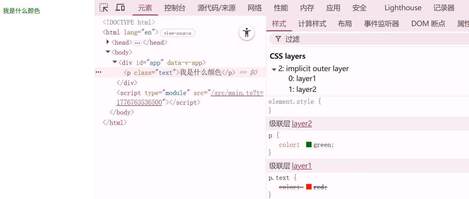 可以看到生效的是绿色,这是因为非 layer 的样式就是高于 layer 内的样式的,你可以理解为没有被 @layer 包裹的样式默认生成了一个匿名的 layer ,这个 layer 位于所有定义的 layer 之后。